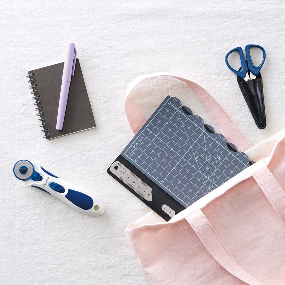 Compact size that can be folded and carried A convenient mat used when cutting fabric with a rotary cutter. It's compact enough to fit in your bag, making it easy to carry. (29 x 18 cm when unfolded. 15 x 18 cm when folded)