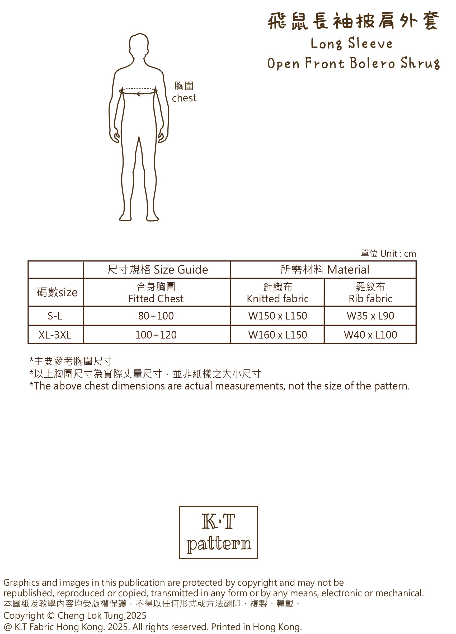 K·T Pattern | Long Sleeve Open Front Bolero Shrug 飛鼠長袖披肩外套 | pattern 紙樣(影片教學 sewing tutorial video)