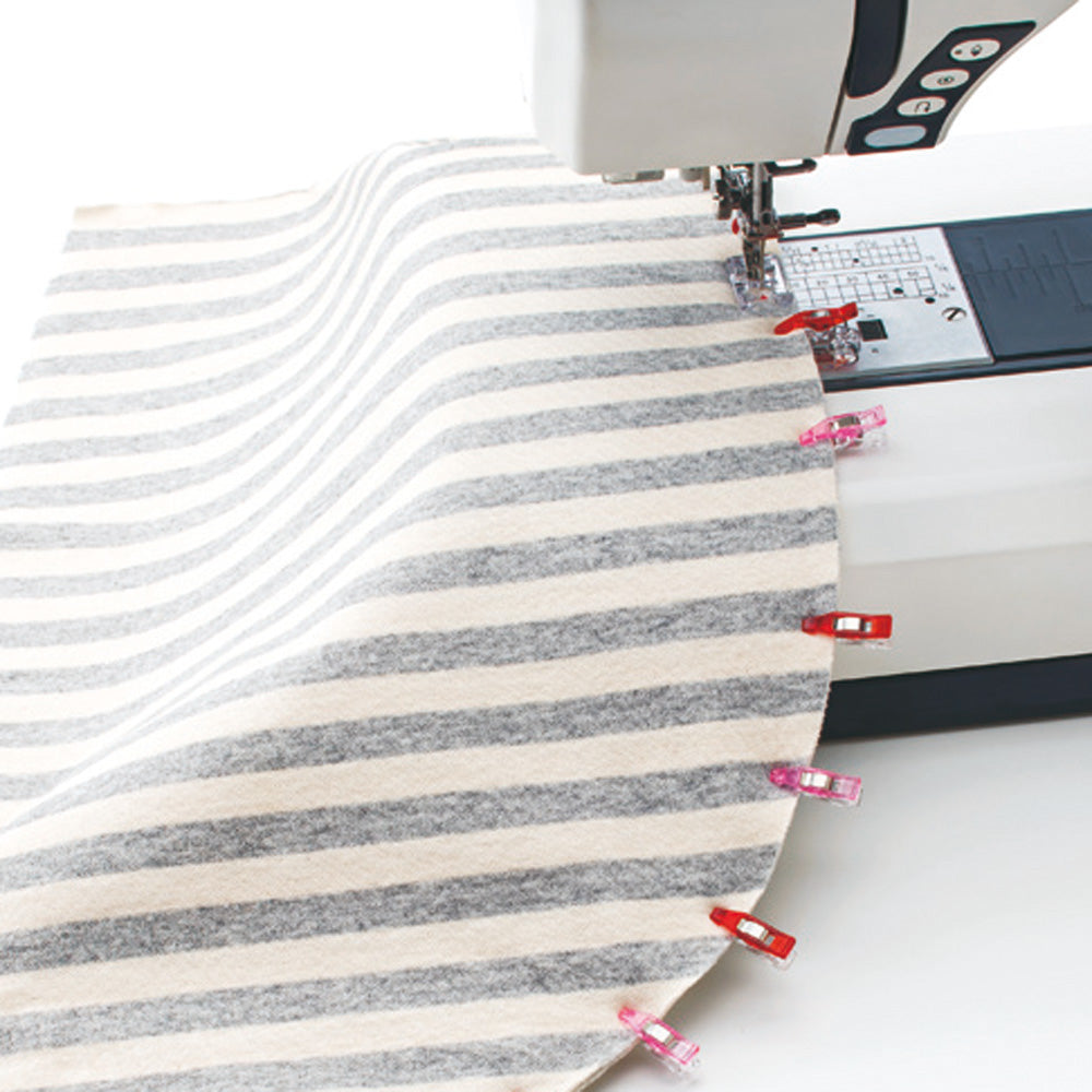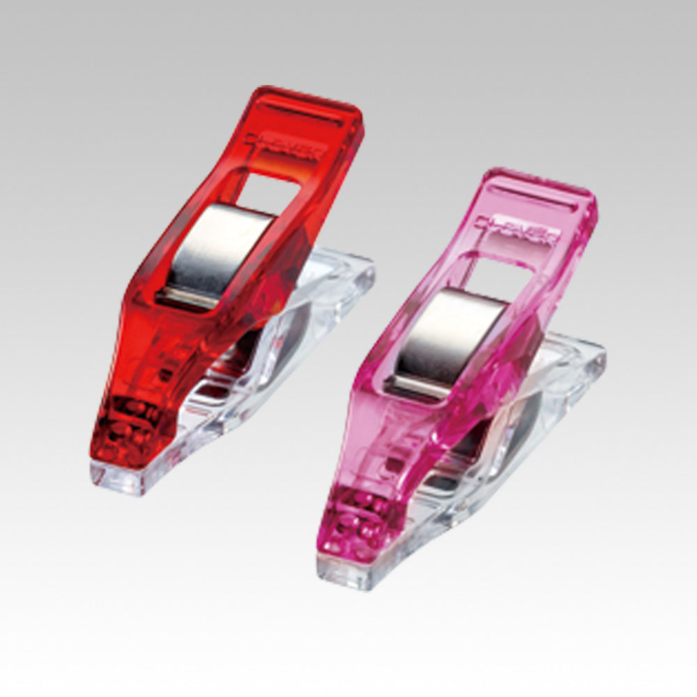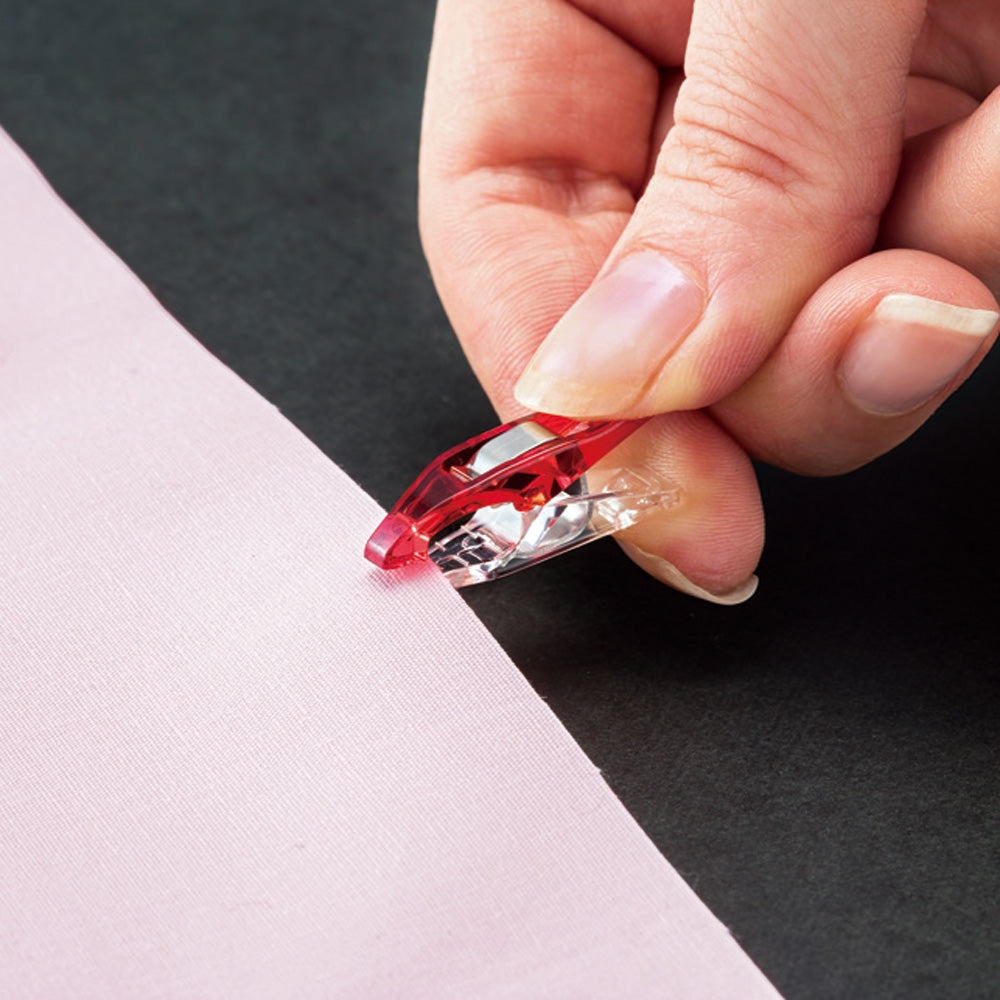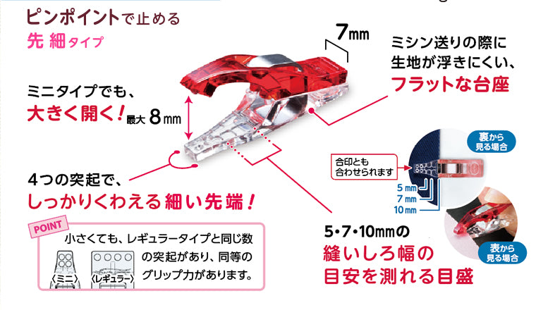 - 適用於固定一般厚度和薄織物、合成皮革、皮革等。 用於臨時固定難以用大頭針固定的織物!最大的開口寬度(最大約8mm)使固定較厚的織物變得容易。強力固定夾中的核度線,可測量寬度為5mm,7mm和10mm的縫製邊距。