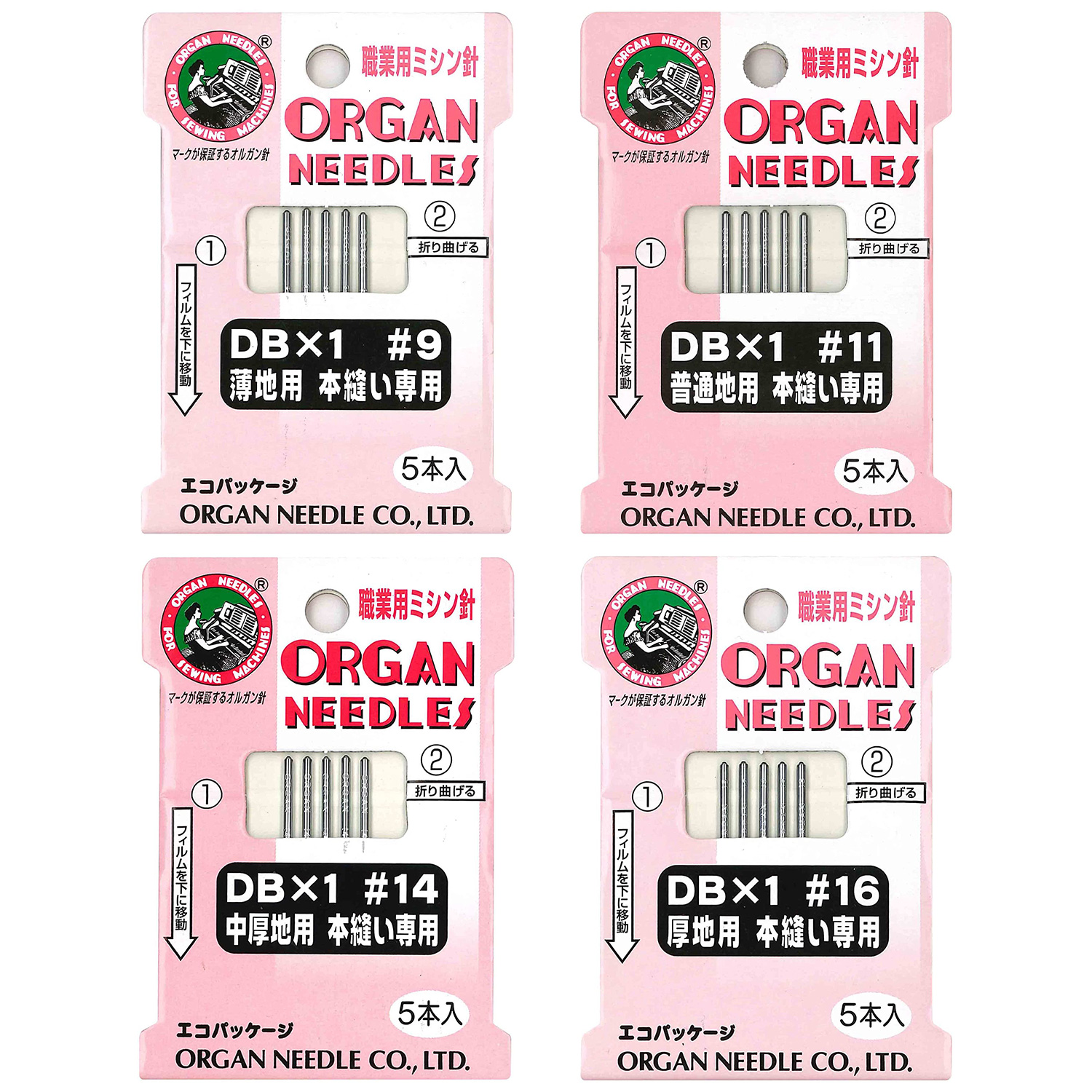 包裝 : 一包5支針號數 布料厚度 布料 棉線 絹線、合成纖維線 HA×1 #9 薄布料 絲綢、喬其紗、透明硬紗等 #80~#60 #100~#50 HA×1 #11 一般布料 印花布、絨面呢、浴衣布等 #80~#50 #80~#40 HA×1 #14 中厚布料 羊毛面料、緊密斜紋毛織物等 #60~#40 #50~#30 HA×1 #16 厚布料 牛仔布、帆布、厚防水布等 #50~#30 #40~#20 -