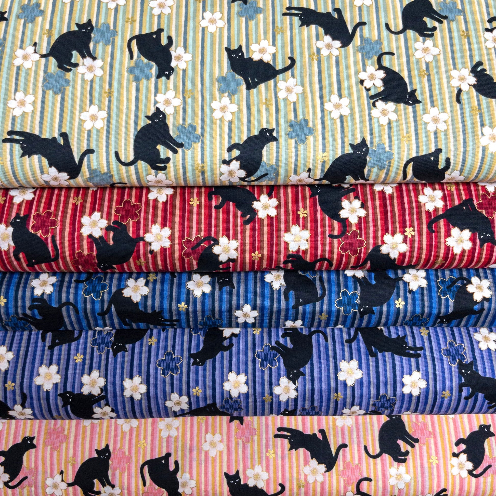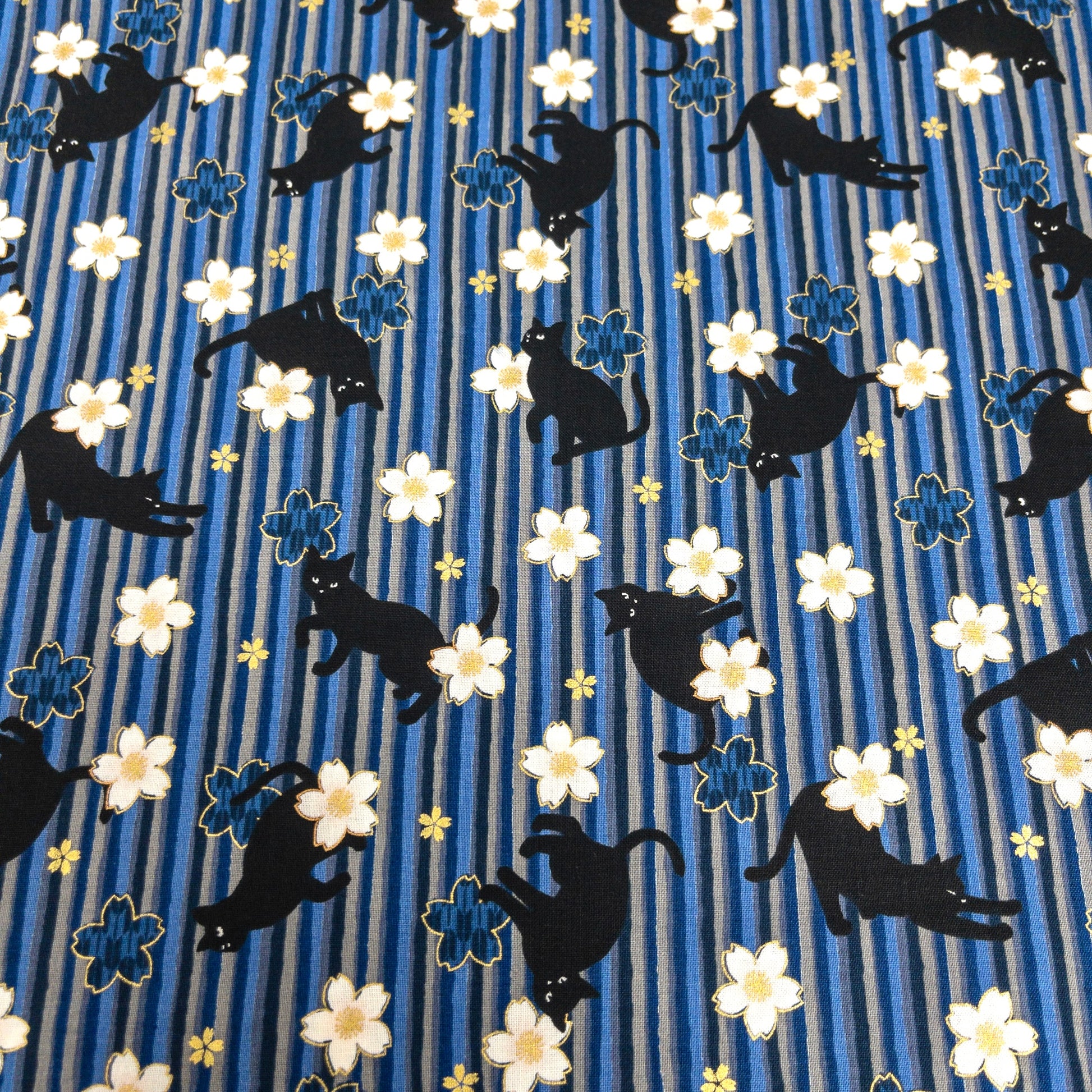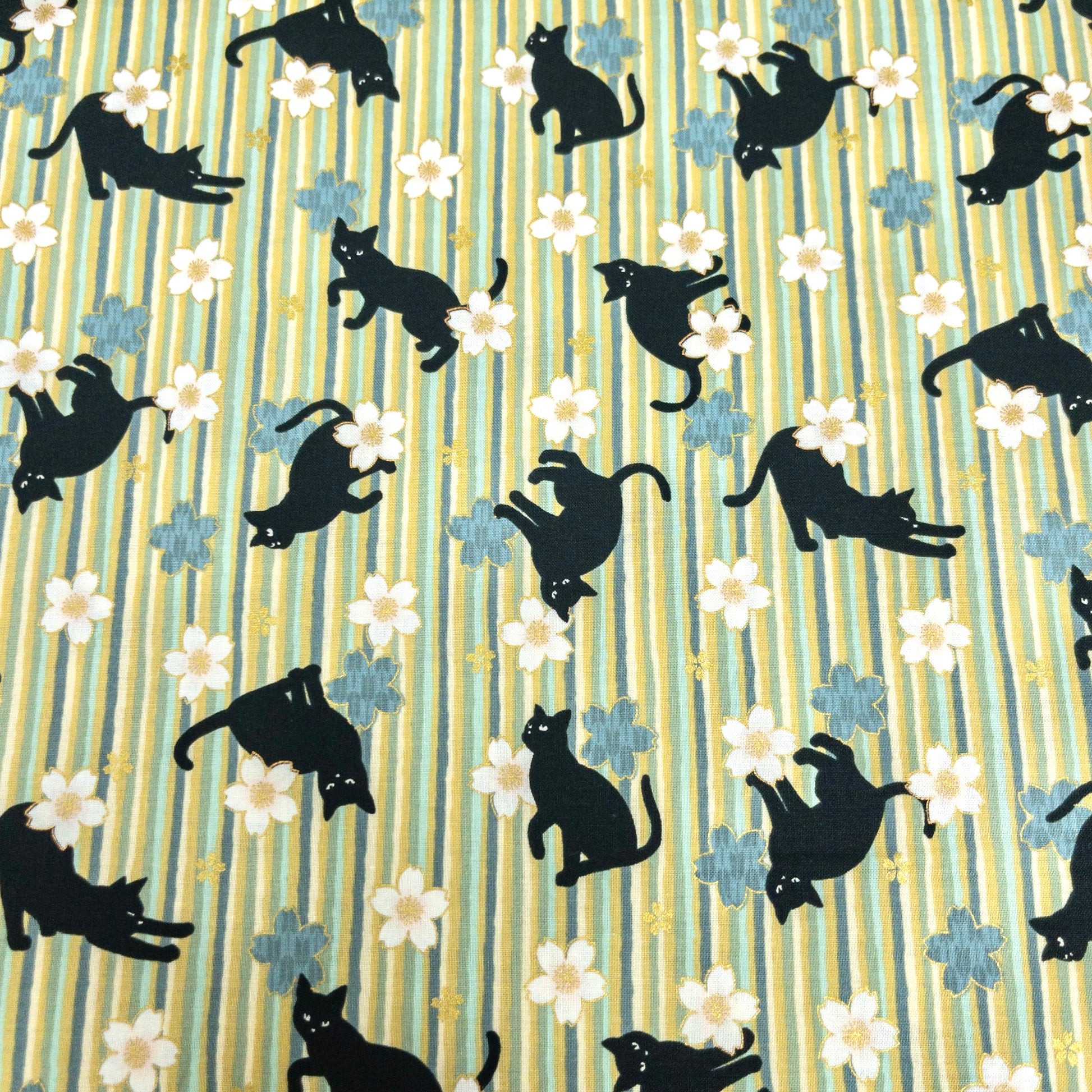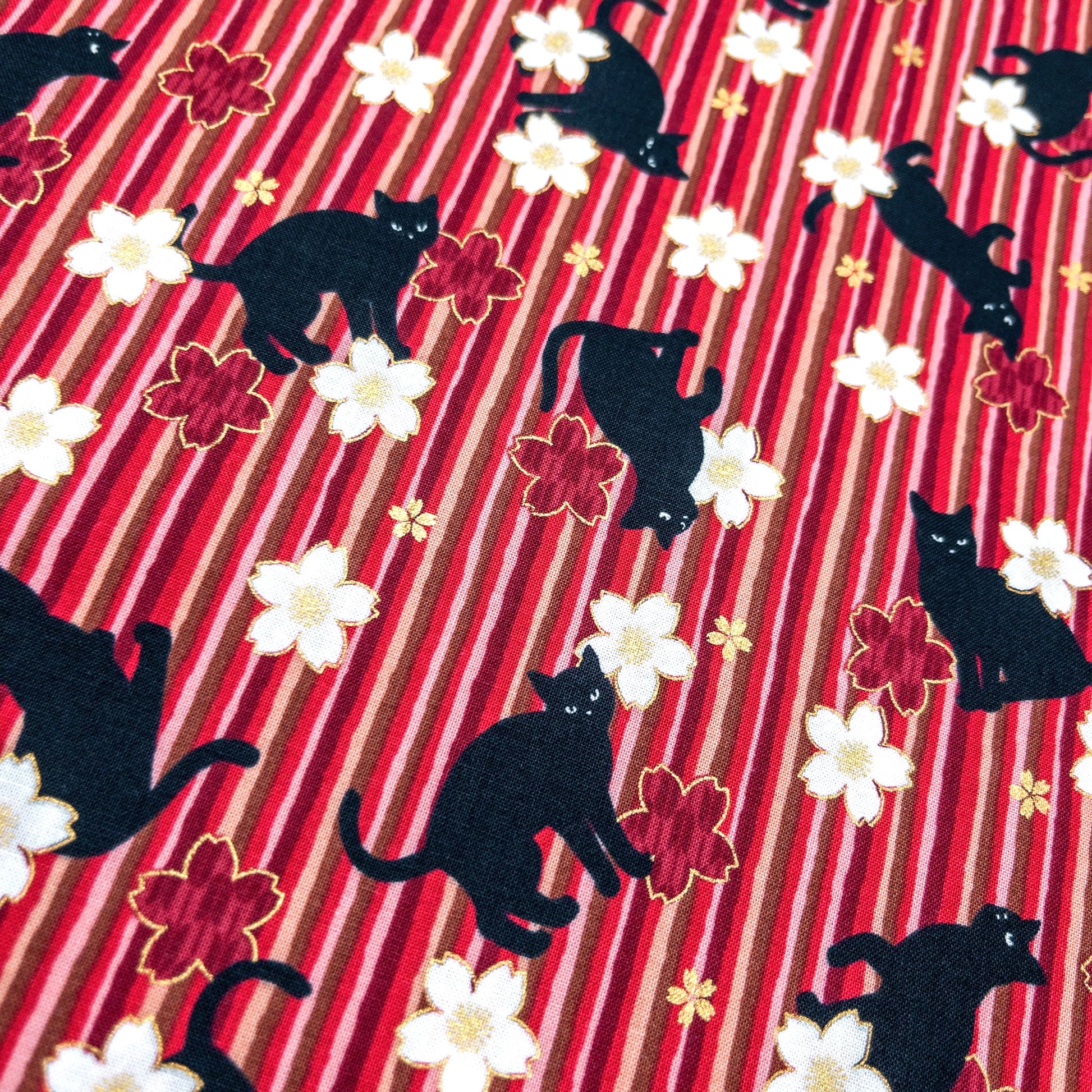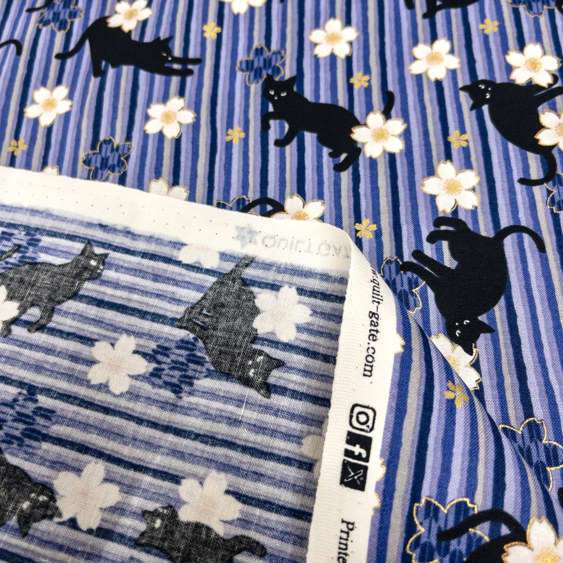 Quilt Gate | bronzing sakura stripe black cats 燙金櫻花間條黑貓 | cotton printed sheeting 純棉